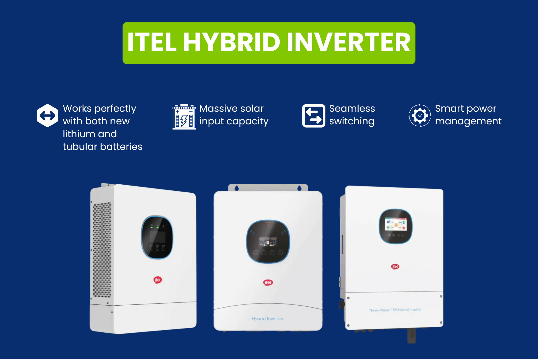 This is the all-in-one choice for families who want both zero bills and zero blackouts. The itel Hybrid manages your solar panels, the grid, and your batteries all at once. Available in 4kW, 6kW, and 8kW Single-Phase, as well as 8kW and 12kW Three-Phase models.